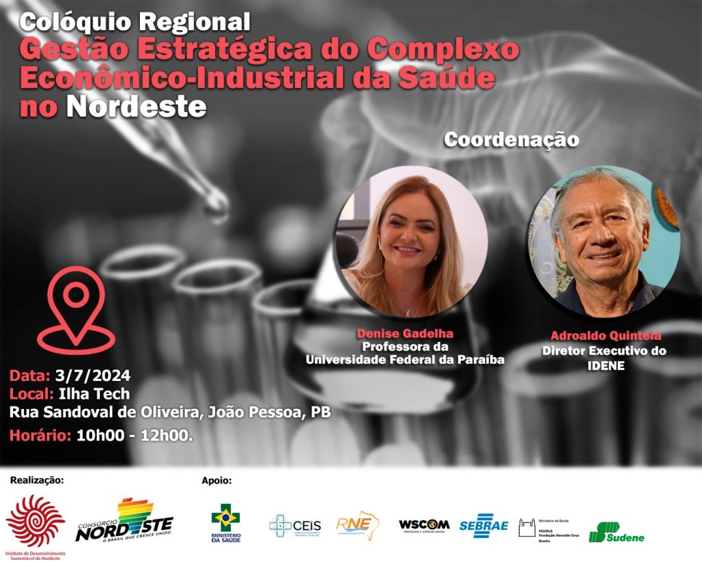 O Instituto de Desenvolvimento do Nordeste Brasileiro – IDENE, em parceria com a Secretaria de Ciência Tecnologia e Inovação e do Complexo Industrial da Saúde- SECTICS/Ministério da Saúde, da Universidade Estadual da Paraíba – UEPB, da Fundação de Apoio à Pesquisa do Estado da Paraíba – FAPESQ, do Consórcio Nordeste, da Revista Nordeste e a Ilha Tech de Relações Empresariais na Paraíba, realizam colóquio Gestão Estratégica do CEIS Nordeste, em 3/7/2024, quarta-feira, no horário das 10h00 12h00.
