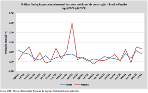 No acumulado deste ano, frente à variação percentual observada no mesmo período de 2023, o custo médio da construção civil, na Paraíba, teve alta de 2,61%. O avanço foi maior que os verificados nas médias do Brasil (1,97%) e da região (2,38%), tendo sido o 11º mais elevado entre todas as unidades da federação. Por sua vez, no acumulado de 12 meses, comparado ao período anterior de 12 meses, houve crescimento de 2,94% no índice estadual, acima tanto da média nacional (2,66%), como da regional (2,78%), embora tenha sido o 11º menor do país.