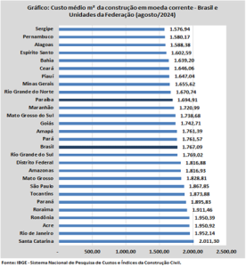 No acumulado de 12 meses, em comparação com o período anterior de 12 meses, o custo paraibano apresentou variação de 2,74%, a 9ª menor do país, abaixo das médias regional (3,22%) e nacional (3,12%). No ano de 2024, o índice teve alta de 2,64%, menor que a média do Nordeste (2,77%) e ligeiramente maior que a geral do país (2,61%).