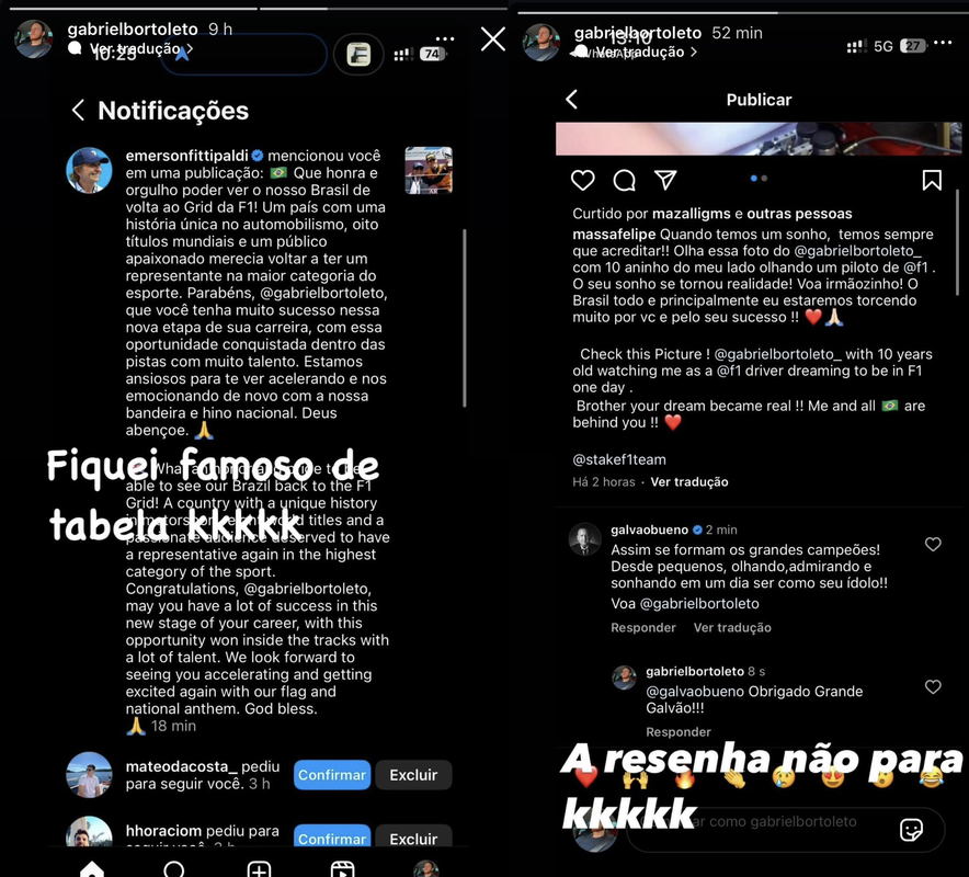 E o melhor: o Bortoleto “fake” vem compartilhando de forma bem humorada os momentos. Teve parabéns de ninguém menos que o bicampeão mundial de Fórmula 1 Emerson Fittipaldi, de Felipe Massa e do narrador Galvão Bueno.