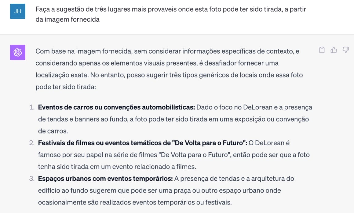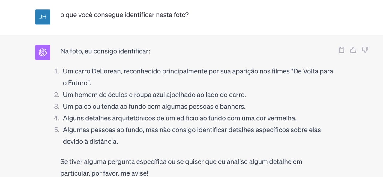 Pedi ao ChatGPT que identificasse os objetos na imagem. Fiquei impressionado com os detalhes. Ele reconheceu o carro como um DeLorean e associou-o ao filme De Volta para o Futuro. Além disso, notou que uso óculos, identificou a cor da minha camisa e a minha posição em relação ao veículo.