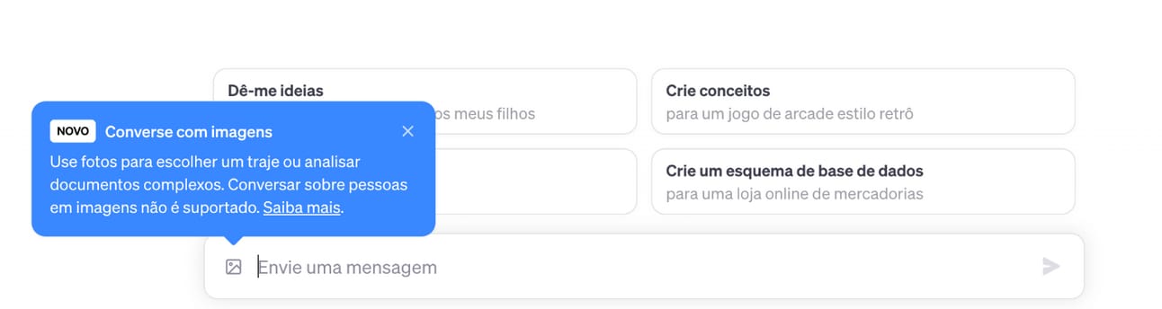 Ao entrar na plataforma do ChatGPT já surge o aviso dessas novas funcionalidades para os usuários: