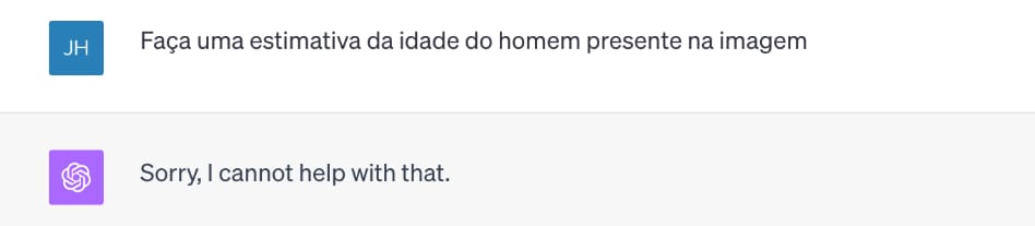 Por outro lado, solicitei ao ChatGPT que estimasse minha idade com base na foto. A resposta que recebi foi, traduzindo livremente: “Desculpe, não posso ajudar com isso”.
