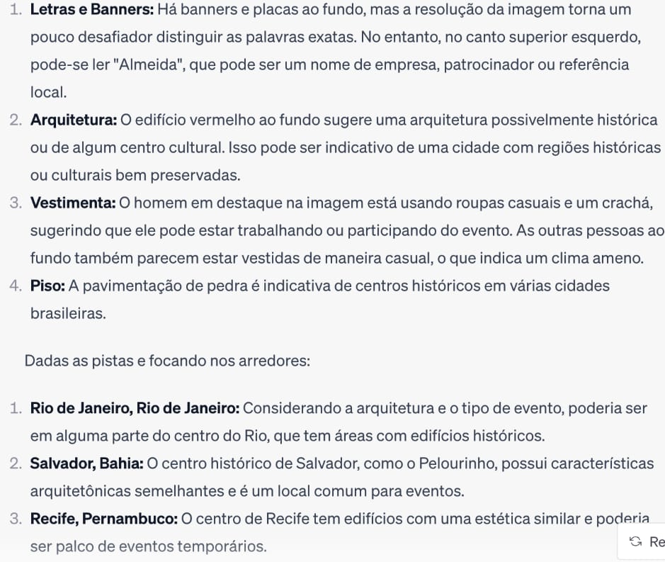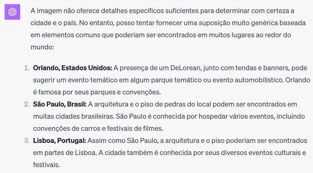 Com base apenas nos detalhes visuais da foto, como as tendas e a arquitetura dos prédios ao fundo, a IA sugeriu que a foto pode ter sido tirada em uma área urbana onde ocorrem eventos temporários ou festivais. Em seguida, solicitei as possíveis cidades no mundo onde essa foto poderia ter sido tirada: