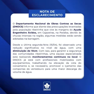 Através de uma nota de esclarecimento, o DNOCS afirma que “algumas medidas estão sendo tomadas na barragem” e que após uma diminuição de 10cm no volume do açude, “uma equipe especializada está realizando monitoramentos contínuos no local”.